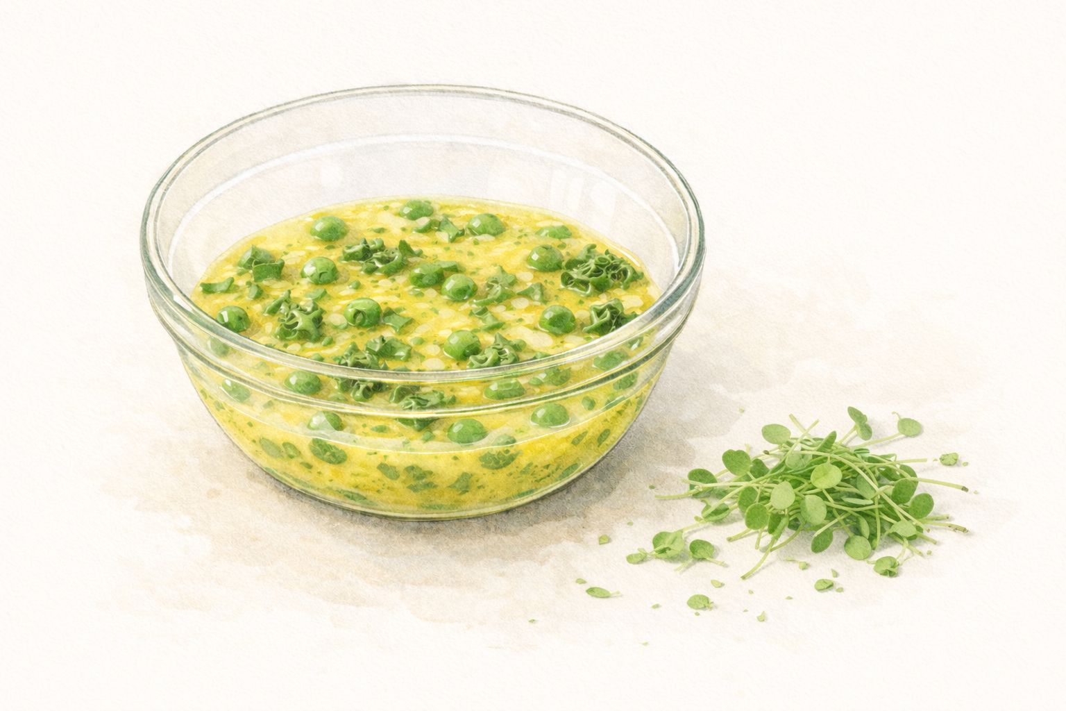 A frittata as a dinner dish needed more than just the microgreens. Spring suggested asparagus or peas. Asparagus would need pre-cooking, an extra step on a weeknight. Peas could go straight in, and their sweetness would sit naturally against the tang of a goat cheese I was planning to dot across the top before the broiler.